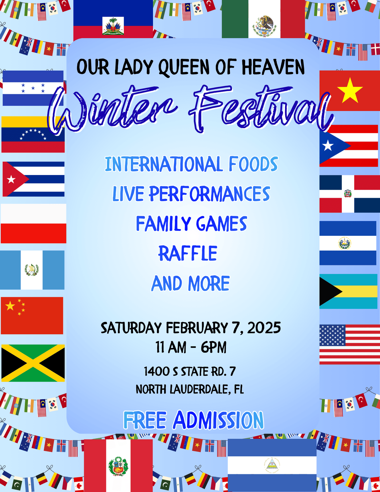 When coming to worship with us at Our Lady Queen Of Heaven Parish, you will find a warm welcome home and a sacred space in which to pray. More importantly, we hope you find in this community and in our worship a living sign of Christ’s redeeming love for you and for all people brought to us on earth through Mary, the Queen of Heaven. We are a congregation made up of people who live in the neighborhood, all over North Lauderdale and Margate area, and beyond. We come from six continents and range in age from newborn to nearly one hundred. We were raised in the Catholic Church, in some other Church, or with no faith at all.